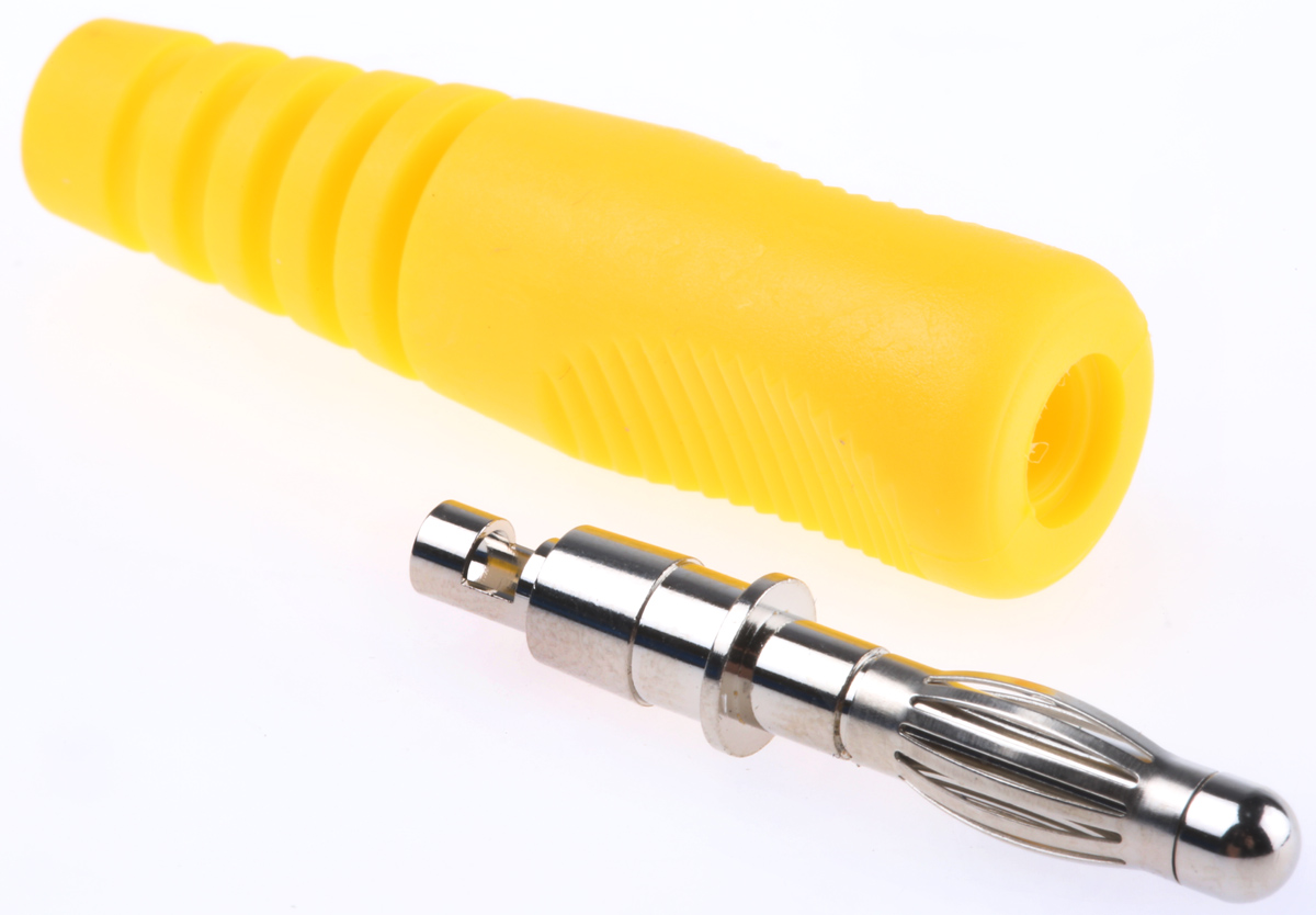 This is Yellow 4mm Banana Plug Nickel Plated 50V 16A manufactured by Schutzinger. The manufacturer part number is 1701122-06/RS. The product has a current rating of 16a. Moreover, the product has a nominal 50v voltage rating. In addition, male is the available "Gender" of the product. It has a decent yellow colour. The high-quality nickel is used as contact plating material. It has a robust pe insulation material. The product is made from sturdy brass materials. It comes in banana plug configuration. The connector has 4 mm size. It contains a spring contact .