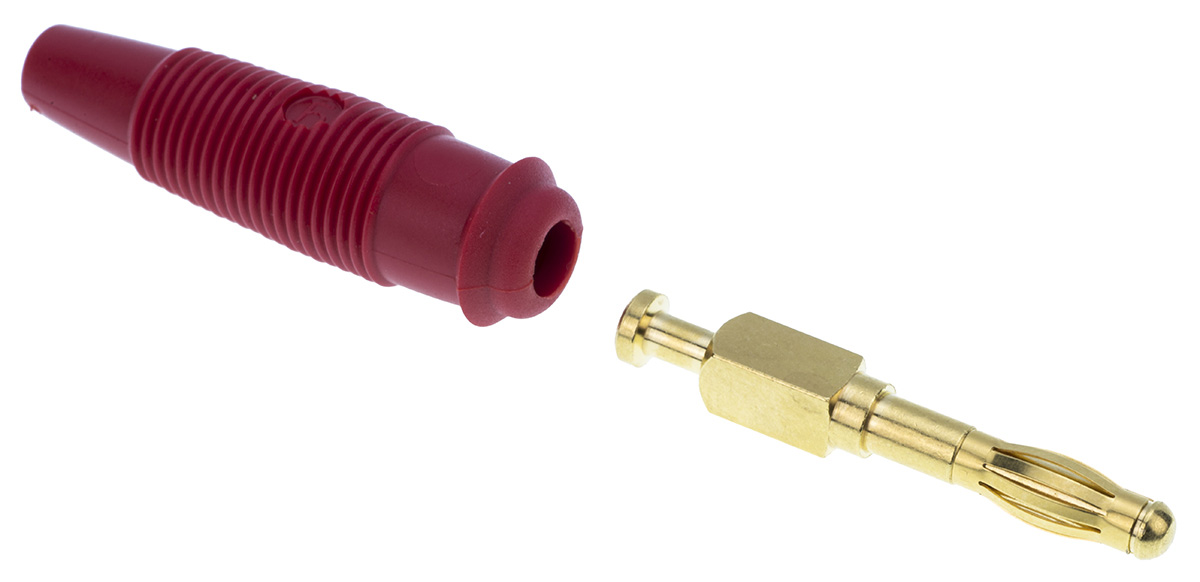 This is Red 4mm Banana Plug Gold Plated 30 V ac 60 V dc 32A manufactured by Hirschmann Test & Measurement. The manufacturer part number is 972518701. The product has a current rating of 32a. Moreover, the product has a nominal 30 v ac, 60v dc voltage rating. In addition, male is the available "Gender" of the product. It has a decent red colour. Its accurate length is 60mm. The high-quality gold is used as contact plating material. It allows solder termination method. It has a robust pvc-p insulation material. The product is made from sturdy beryllium copper, brass materials. It comes in banana plug configuration. The connector has 4 mm size. It contains a spring contact .