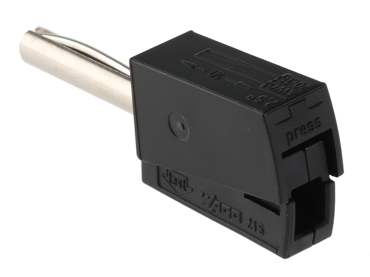 This is Black 4mm Banana Plug Nickel Plated 42V 20A manufactured by Wago. The manufacturer part number is 215-311. The product has a current rating of 20a. Moreover, the product has a nominal 42v voltage rating. In addition, male is the available "Gender" of the product. It has a decent black colour. Its accurate length is 40mm. The high-quality nickel is used as contact plating material. It allows cage clamp termination method. It comes in banana plug configuration. The connector has 4 mm size. The product is made from sturdy brass materials.