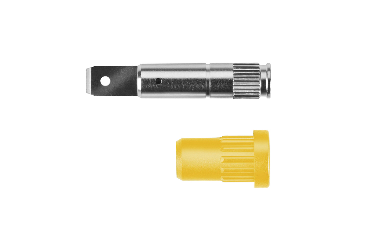 This is Press-in socket 33 Vac 70 Vdc 24 A manufactured by Schutzinger. The manufacturer part number is EPB 6792 / Ni / FST 4.8x0.8 / GE. The product has a current rating of 24a. Moreover, the product has a nominal 33 v ac, 70v dc voltage rating. In addition, female is the available "Gender" of the product. It has a decent yellow colour. Its accurate length is 30.5mm. The high-quality nickel is used as contact plating material. It has a robust nylon insulation material. It comes in banana socket configuration. The connector has 4 mm size. The product is made from sturdy brass materials.