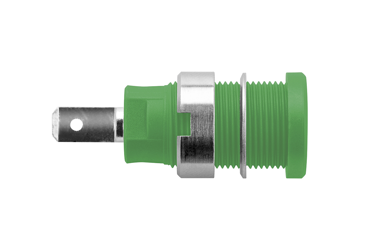 This is Safety threaded socket 1000 V CAT III manufactured by Schutzinger. The manufacturer part number is SEB 7077 Ni / GN. The product has a current rating of 24a. Moreover, the product has a nominal 1000v voltage rating. In addition, female is the available "Gender" of the product. It has a decent green colour. Its accurate length is 33mm. The high-quality nickel is used as contact plating material. It has a robust nylon insulation material. It comes in banana socket configuration. The connector has 4 mm size. The product is made from sturdy brass materials.