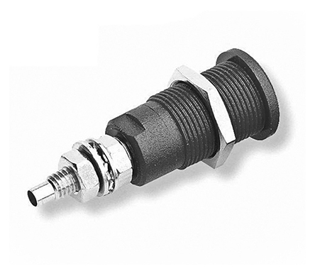 This is Mueller Black Female Banana Plug - Stud 1 kV 600 V manufactured by Mueller Electric. The manufacturer part number is BU-31607-0. The product has a current rating of 35a. Moreover, the product has a nominal 1000 v, 600v voltage rating. In addition, female is the available "Gender" of the product. It has a decent black colour. Its accurate length is 39mm. The high-quality nickel is used as contact plating material. It allows stud termination method. It has a robust abs, nylon insulation material. It comes in banana socket configuration. The connector has 4 mm size. The product is made from sturdy brass materials.