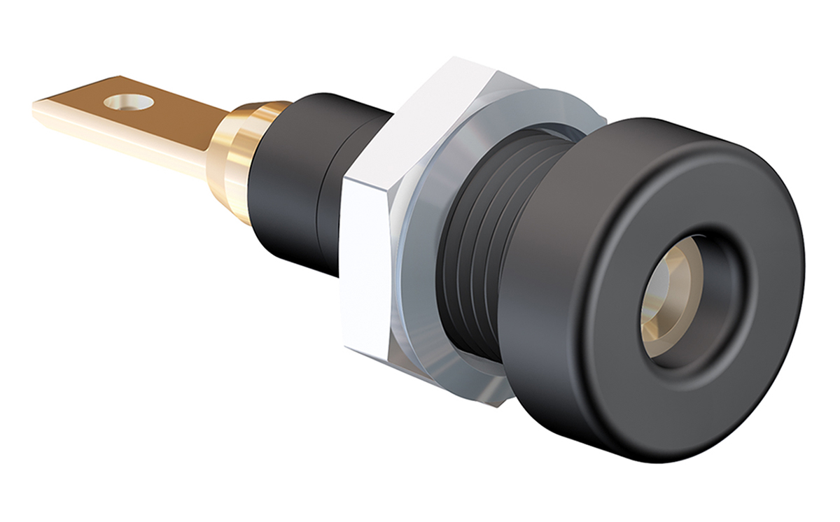 Multi-Contact LB-12R 2mm Rigid Panel Mount Socket Multi-Contact LB-12R series 2 mm panel mount socket connectors feature a rigid socket machined from brass, M6x0.5 thread for mounting into pre-drilled holes and has a flat 2.8 x 0.8 mm tab. The LB-12R range of rigid panel mount sockets is for use with the SLS205-L range of multilam plug connectors, this combination offers secure and reliable repeat connectivity for your desired application. Supplied complete with washer and locknut, overall diameter of the plug entry point is 8.5mm diameter. Insulated 2mm rigid socket Optalloy® finish Flat connecting tab (2.8mm x 0.8mm) Supplied with fixings Can be screwed into pre-drilled panels Rated up to 30Vac / 60Vdc at 10A Compatible with SLS205-L 2mm plug Note Suitable for use with the SLS205-L range of multilam test lead plugs see 763-2897 and range. 2mm Multi-Contact Test Lead Plug and Socket Connectors Multi-Contact 2 mm rigid and multilam plug connectors and socket connectors range is suitable for many applications that call for a self assembled 2 mm diameter plug test lead or a panel mount receptacle socket connector. The test plug insulator is assembled over an associated cable prior to soldering into the solder bucket, it is then a press fit over the 2 mm plug tang to complete.