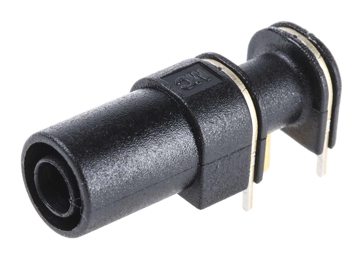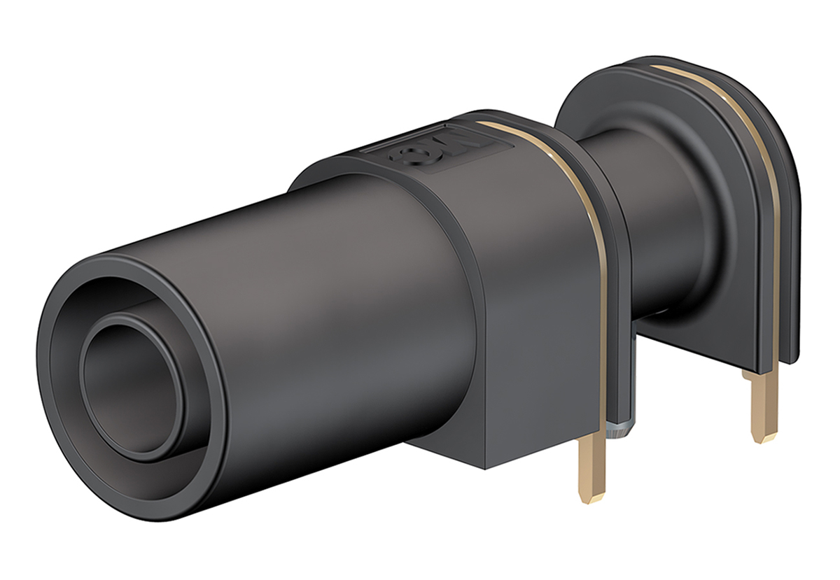 Multi-Contact XELW-4 Series 4 mm Angled Socket Connectors, PCB mount Multi-Contact 4 mm right angled socket connectors are pcb mount connectors complete with a rigid socket, designed to accept spring loaded (multilam) plugs with a rigid insulating sleeve, available in red or black and featuring a 2 mm central pcb contact and 4 x 0.8 mm board mount pins. 1000V ,CAT III 24 A