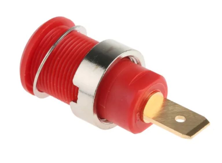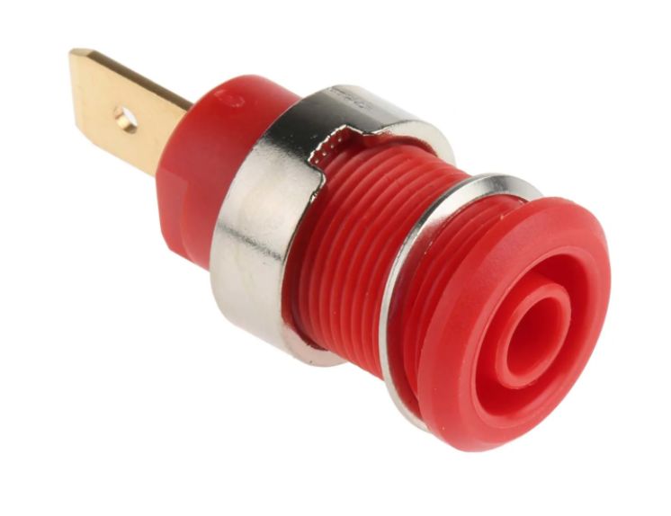 4 mm laboratory socket with tab connection 6.3 mm Length: 33 mm, mounting hole Ø: 12.5 Fully insulated 4 mm laboratory safety socket with PVC thread and 6.3 x 0.8 mm plug connector. Suitable for laboratory safety cables.