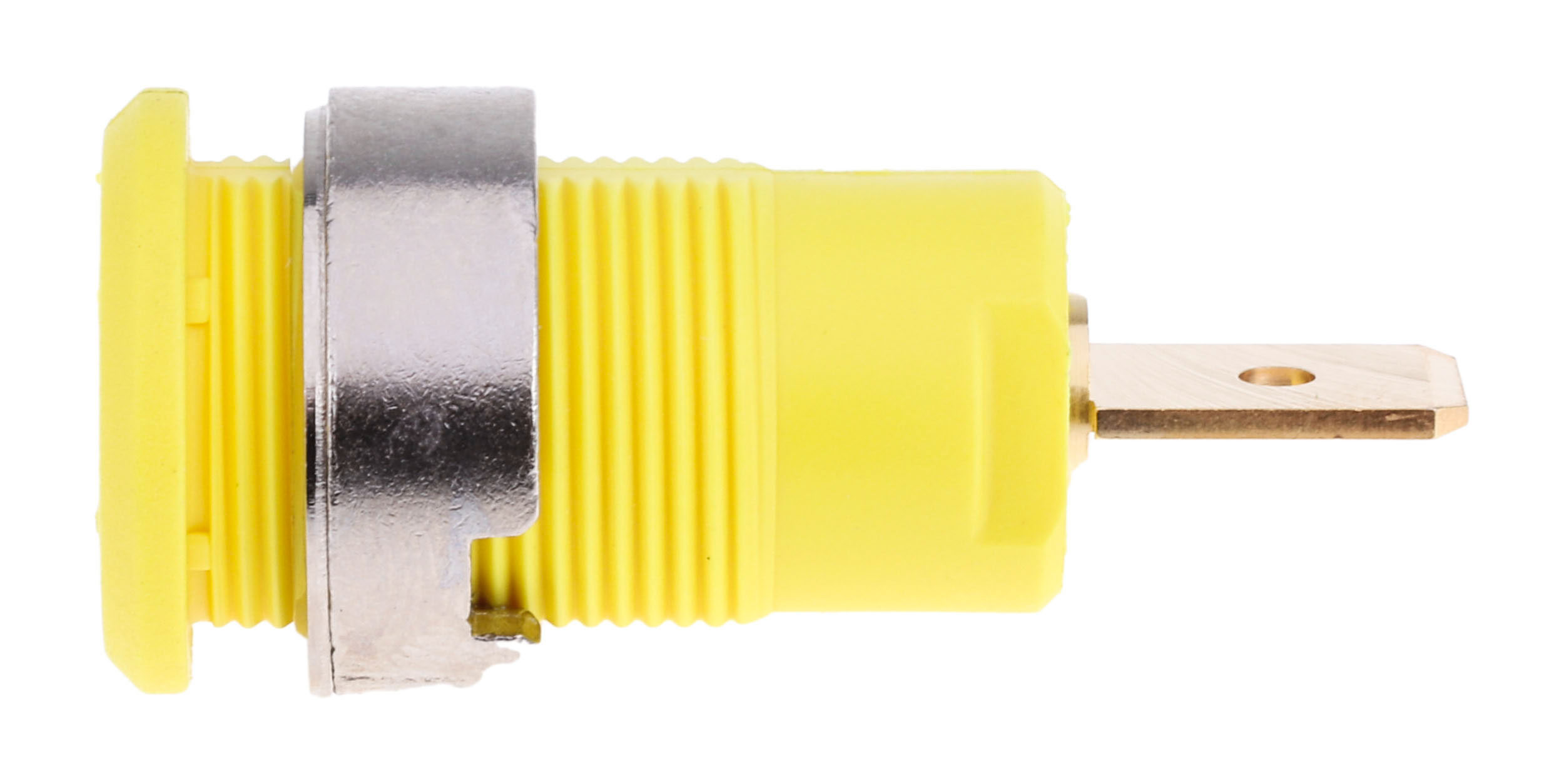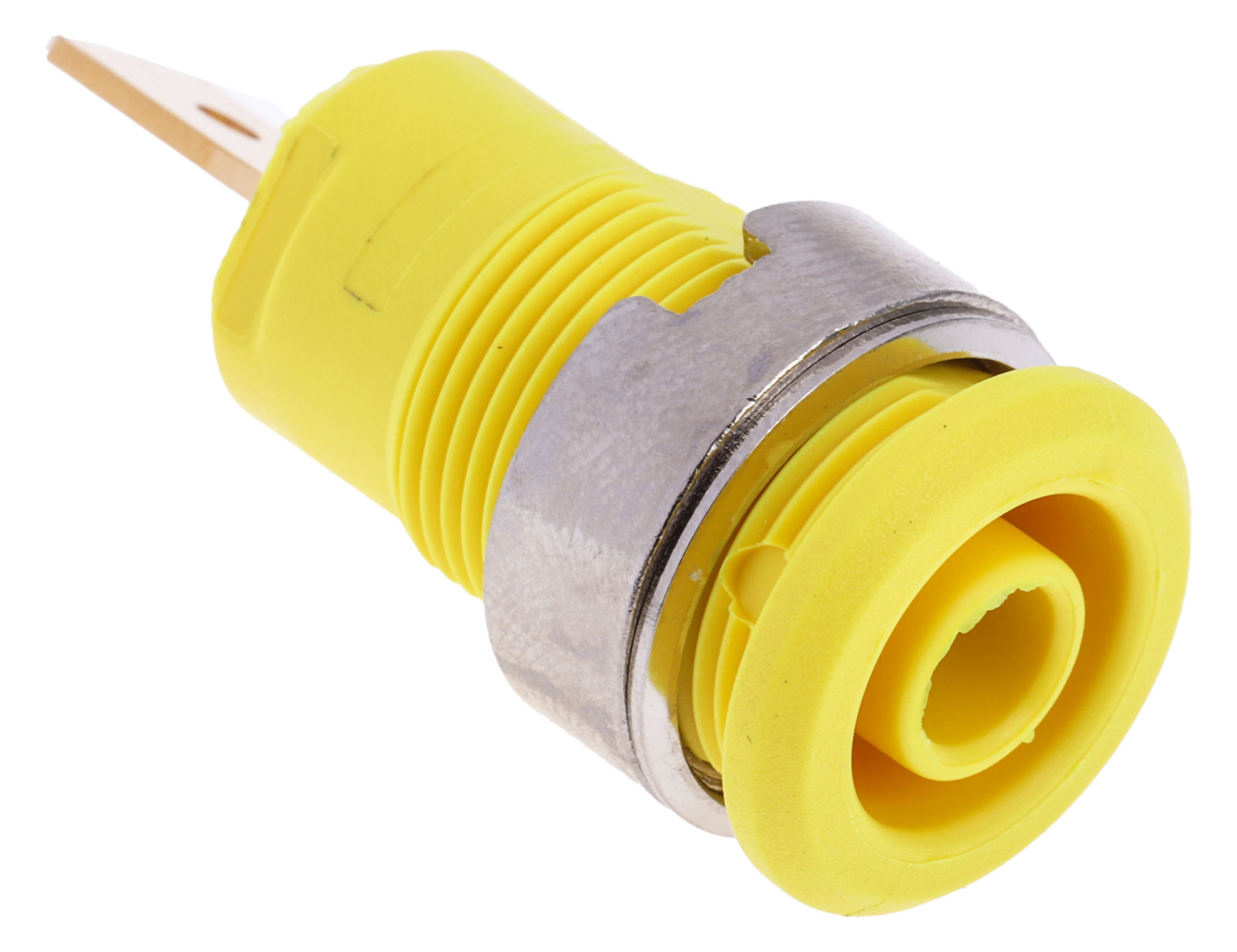 This is HCK Yellow Female Banana Plug - Tab 1kV manufactured by Staubli. The manufacturer part number is 23.3060-24. The product has a current rating of 32a. Moreover, the product has a nominal 1000v voltage rating. In addition, female is the available "Gender" of the product. It has a decent yellow colour. Its accurate length is 33mm. The high-quality gold is used as contact plating material. It allows tab termination method. It comes in banana socket configuration. The connector has 4 mm size. The product is made from sturdy brass materials.