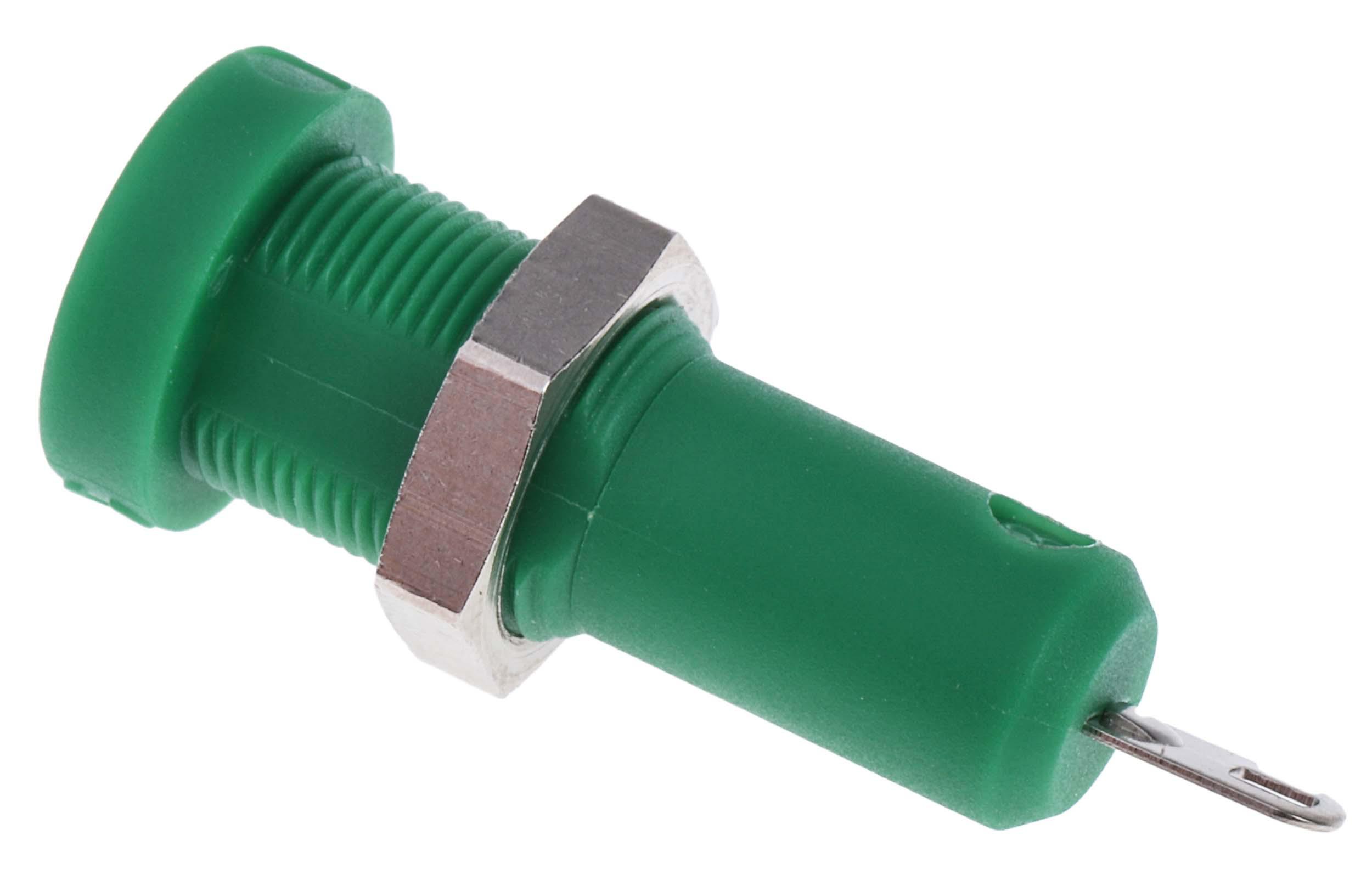 This is Multi Contact Green Female Banana Plug - Solder 30 V ac 60 V dc manufactured by Staubli. The manufacturer part number is 23.0450-25. The product has a current rating of 25a. Moreover, the product has a nominal 30 v, 60v dc voltage rating. In addition, female is the available "Gender" of the product. It has a decent green colour. Its accurate length is 29.5mm. The high-quality nickel is used as contact plating material. It allows solder termination method. It comes in banana socket configuration. The connector has 4 mm size. The product is made from sturdy brass materials.