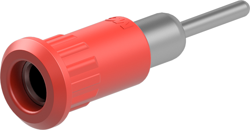 The Staubli EB4-IR/N banana test conn socket 60VDC red nickel plated it is insulated, and rigid. The socket is pressed into predrilled panels of plastic, metal etc. Round connecting pin 1.9 mm Diameter of plug system is 4 mm Component parts are I-EB4-I, B-EB4-IR_NI