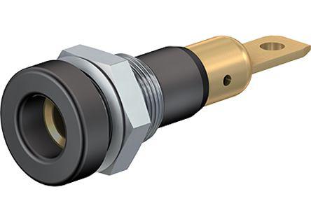 This is Black 4mm Test Connector Gold Plated 30 V ac 60 V dc 25A manufactured by Multi Contact. The manufacturer part number is 23.0190-21. The product has a current rating of 25a. Moreover, the product has a nominal 30 v ac, 60 v dc voltage rating. In addition, female is the available "Gender" of the product. It has a decent black colour. Its accurate length is 31.5mm. The high-quality gold is used as contact plating material. It allows screw termination method. The product is made from sturdy brass materials.