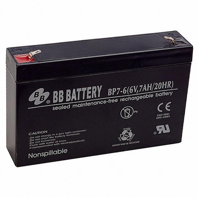 This is manufactured by B B Battery. The manufacturer part number is BP7-6-T1. The module has the capacity of 7ah. It is assigned with possible HTSUS value of 8507.20.8031. The product is not applicable. Moreover, it has spade, .187" (4.7mm) terminal style. Its typical moisture sensitivity level is not applicable. It also exhibits voltage rating of 6 v. In addition, it is reach unaffected. The product's diameters include 6.00" l x 1.40" w x 3.76" h (152.5mm x 35.5mm x 95.5mm). It has a long 20 weeks standard lead time. The typical product's weight is 1300 g. The typical discharge rate of the product is 20hr. The product bp, is a highly preferred choice for users. In addition, bulk is the available packaging type of the product. Features a sealed lead acid (sla, vrla) battery chemistry. The product is designated with the ear99 code number.