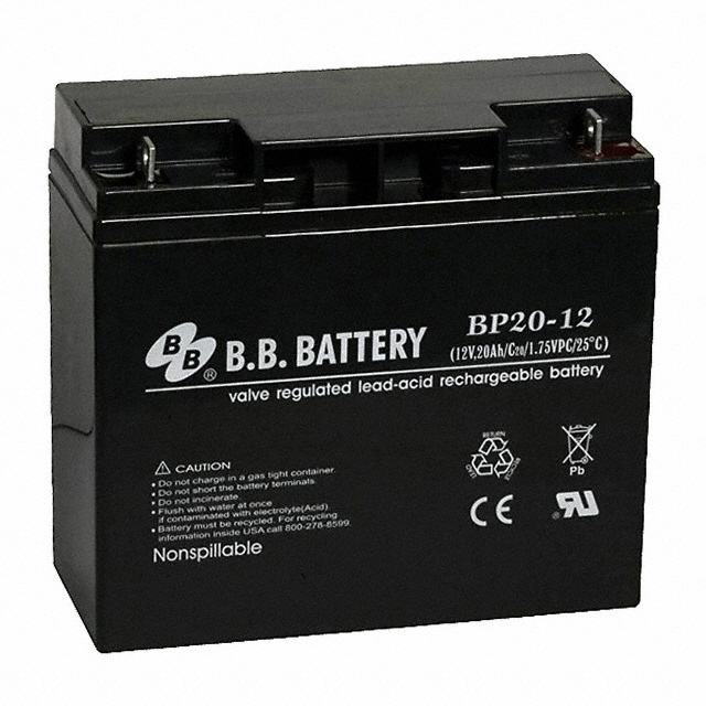 This is manufactured by B B Battery. The manufacturer part number is BP20-12-B1. The module has the capacity of 20ah. It is assigned with possible HTSUS value of 8507.20.8041. The product is not applicable. Moreover, it has nut and bolt, m5 terminal style. Its typical moisture sensitivity level is not applicable. It also exhibits voltage rating of 12 v. In addition, it is reach unaffected. The product's diameters include 7.19" l x 3.05" w x 6.59" h (182.5mm x 77.5mm x 167.5mm). It has a long 20 weeks standard lead time. The typical product's weight is 6400 g. The typical discharge rate of the product is 20hr. The product bp, is a highly preferred choice for users. In addition, box is the available packaging type of the product. Features a sealed lead acid (sla, vrla) battery chemistry. The product is designated with the ear99 code number.