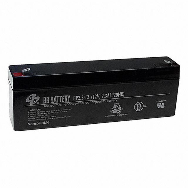 This is manufactured by B B Battery. The manufacturer part number is BP2.3-12-T1. The module has the capacity of 2.3ah. It is assigned with possible HTSUS value of 8507.20.8041. The product is not applicable. Moreover, it has spade, .187" (4.7mm) terminal style. Its typical moisture sensitivity level is not applicable. It also exhibits voltage rating of 12 v. In addition, it is reach unaffected. The product's diameters include 7.07" l x 1.40" w x 2.42" h (179.5mm x 35.5mm x 61.5mm). It has a long 20 weeks standard lead time. The typical product's weight is 952.5 g. The typical discharge rate of the product is 20hr. The product bp, is a highly preferred choice for users. In addition, bulk is the available packaging type of the product. Features a sealed lead acid (sla, vrla) battery chemistry. The product is designated with the ear99 code number.