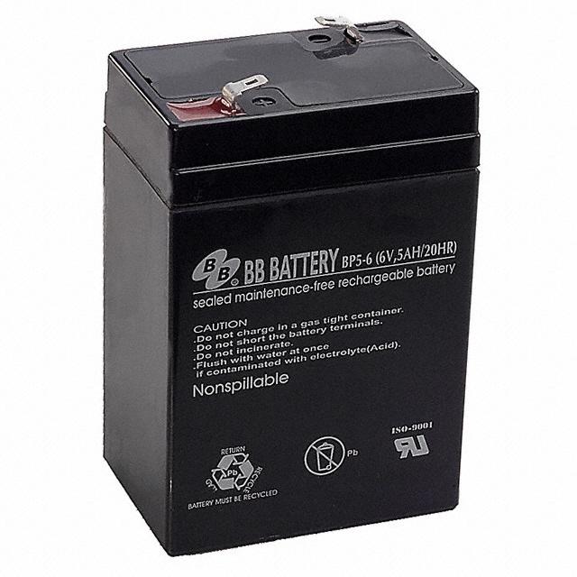 This is manufactured by B B Battery. The manufacturer part number is BP5-6-T1. The module has the capacity of 5ah. It is assigned with possible HTSUS value of 8507.20.8031. The product is not applicable. Moreover, it has spade, .187" (4.7mm) terminal style. Its typical moisture sensitivity level is not applicable. It also exhibits voltage rating of 6 v. In addition, it is reach unaffected. The product's diameters include 2.81" l x 1.95" w x 4.07" h (71.5mm x 49.5mm x 103.5mm). It has a long 20 weeks standard lead time. The typical product's weight is 952.5 g. The typical discharge rate of the product is 20hr. The product bp, is a highly preferred choice for users. In addition, bulk is the available packaging type of the product. Features a sealed lead acid (sla, vrla) battery chemistry. The product is designated with the ear99 code number.