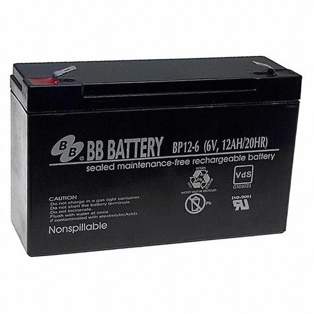 This is manufactured by B B Battery. The manufacturer part number is BP12-6-T2. The module has the capacity of 12ah. It is assigned with possible HTSUS value of 8507.20.8031. The product is not applicable. Moreover, it has spade, .250" (6.3mm) terminal style. Its typical moisture sensitivity level is not applicable. It also exhibits voltage rating of 6 v. In addition, it is reach unaffected. The product's diameters include 6.00" l x 2.07" w x 3.76" h (152.5mm x 52.5mm x 95.5mm). It has a long 20 weeks standard lead time. The typical product's weight is 2000 g. The typical discharge rate of the product is 20hr. The product bp, is a highly preferred choice for users. In addition, bulk is the available packaging type of the product. Features a sealed lead acid (sla, vrla) battery chemistry. The product is designated with the ear99 code number.