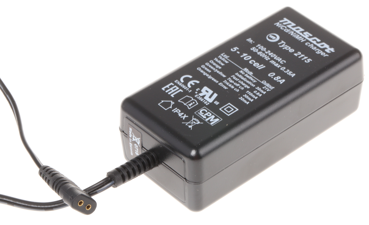 This is 5 → 10 Cell 16W Battery Pack Charger for NiCd NiMH batteries manufactured by Mascot. The manufacturer part number is 2115 5-10 ELEMENTS. It has a standard battery pack size charged battery . The given dimensions of the product include 90 x 45 x 32mm. The typical product's weight is 125g. It has standard 5 → 10 charged cells . It is nicd, nimhchemistries charged . The product offers a maximum 16w output power . Its input voltage is 90 → 264v ac.