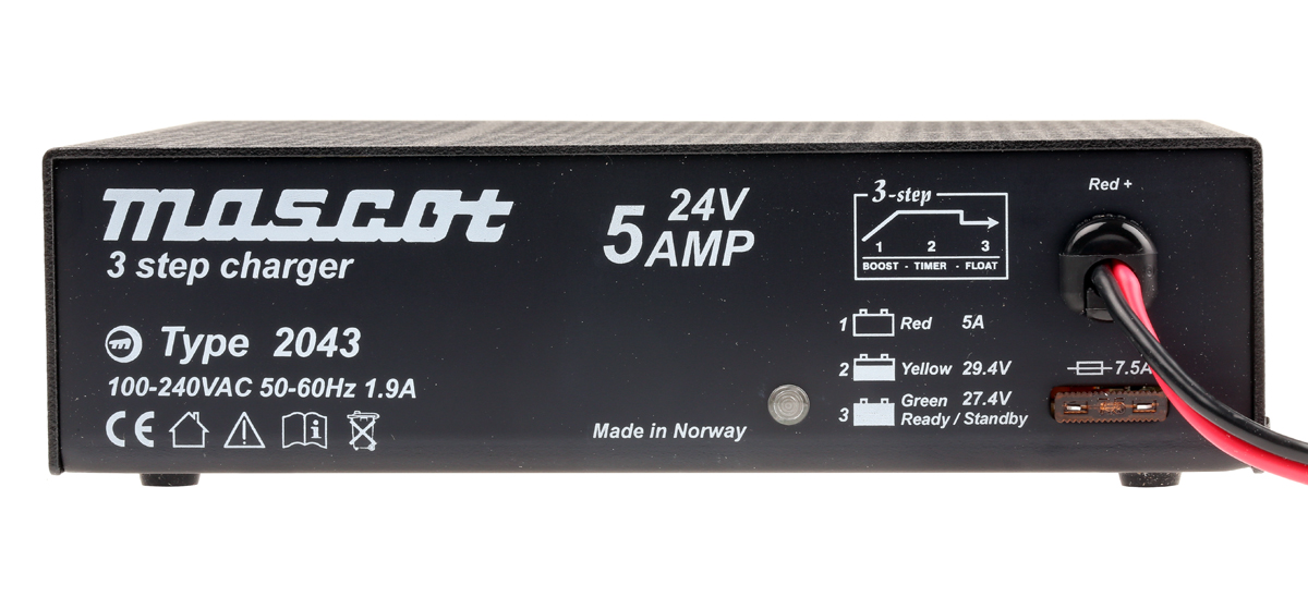 This is 24V 5A Switch Mode Battery Charger manufactured by Mascot. The manufacturer part number is 2043000043. It has a standard 24 v size charged battery . It has about 3 charge stages . The given dimensions of the product include 210 x 148 x 58mm. The typical product's weight is 1.4kg. The plug is a highly reliable eu with long service life. It has a model number 2043. It is lead acidchemistries charged . Its input voltage is 90 → 264v ac. In addition, it has a typical 5 a, 10a charge current . Features a 24v output voltage.