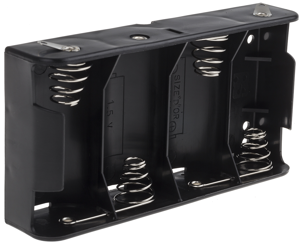 This is Battery Holder for 4 Coil Spring Contact manufactured by RS Pro. The manufacturer part number is 594-426. The given dimensions of the product include 149 x 71 x 28mm. The product has a chassis mount . It is comprised of 4 cells. The product's body is nicely designed from pp materials. Its terminal contact is made up of nickel plated steel material . The terminal contact is kind of coil spring. It is designed for d size battery . It comes in battery holder configuration.