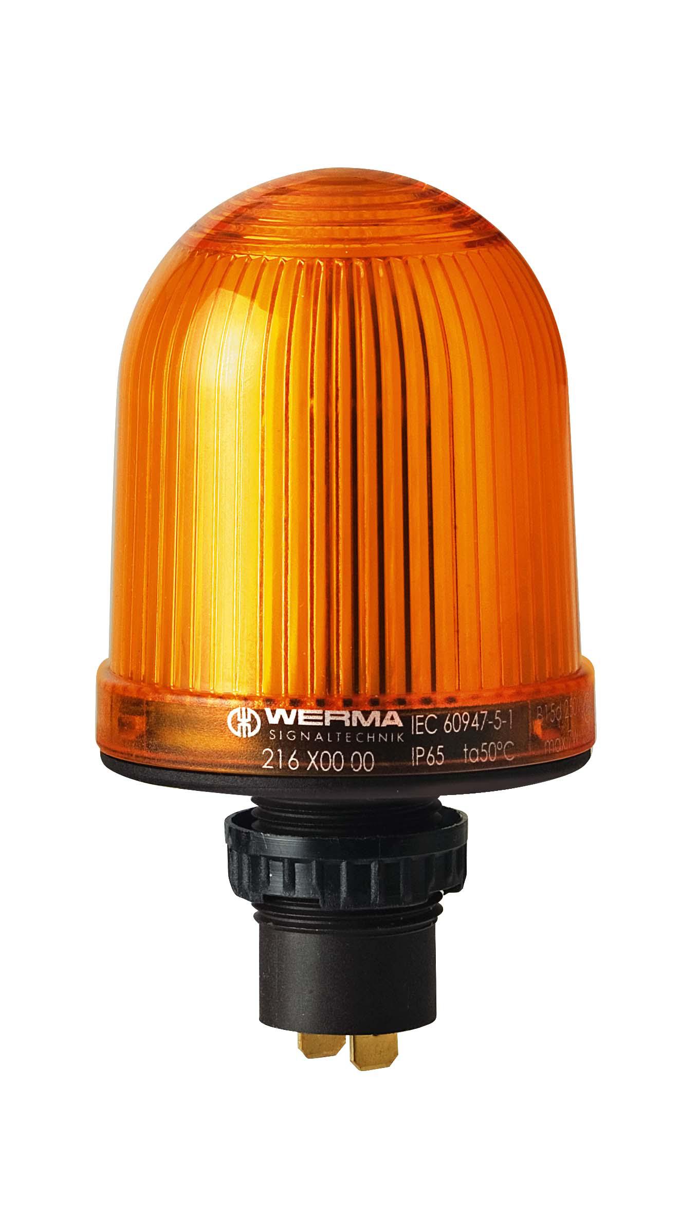 Another 216 Series Continuous Lighting Beacon, this one in yellow, provides a steady warning signal with a filament bulb at 48 V, ensuring constant vigilance with a subtle yet unmistakable alert.