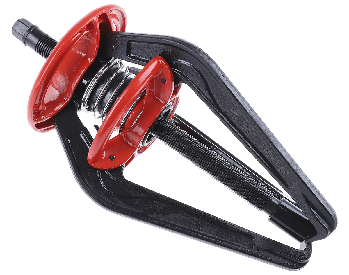 The SKF TMMA 60 is a robust mechanical bearing puller designed for dismounting bearings, gears, pulleys and other ring-shaped components with outer diameters up to 150 mm (5.9 in). It delivers a maximum withdrawal force of 60 kN (~6.7 US tons) and features SKF’s patented spring-operated arms for quick one-hand positioning, self-centring capability, and self-locking jaws for safe operation.
