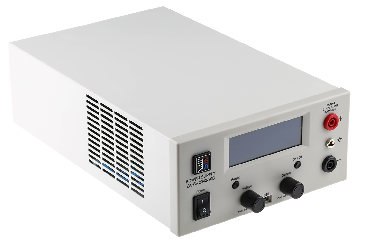 This is Digital Bench Power Supply 1 Output 0 → 42V 0 → 20A 320W manufactured by EA Elektro-Automatik. The manufacturer part number is EA-PS 2042-20B. It is digital . Features a versatile 4 mm safety socket output connector. It carries 20a output current. Additionally, the product is supplied with 1 outputs. The product has +50°c maximum temperature. The product ea-ps 2000 b, is a highly preferred choice for users. Input connector of iec 320. Its bench power supply is of laboratory power supply type . It has a model number ea-ps 2042-20 b. Features a 0 → 42v output voltage. Features 100 → 240v ac supply voltage. While its minimum temperature is 0°c. It includes 2 display(s) . Feature 320w of power rating. It comes in digital configuration.