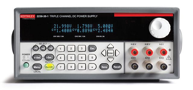 The Keithley 2230G-30-1 is a high precision triple output programmable DC bench power supply, designed for test labs, R&D, and engineering work where multiple voltage rails are needed. It delivers two 30 V / 1.5 A channels, plus a 6 V / 5 A channel, allowing isolated outputs to power both analogue and digital circuits from a single, compact unit. With excellent accuracy, remote sensing, and versatile channel combining, this supply gives you clean, reliable power for demanding measurement tasks.