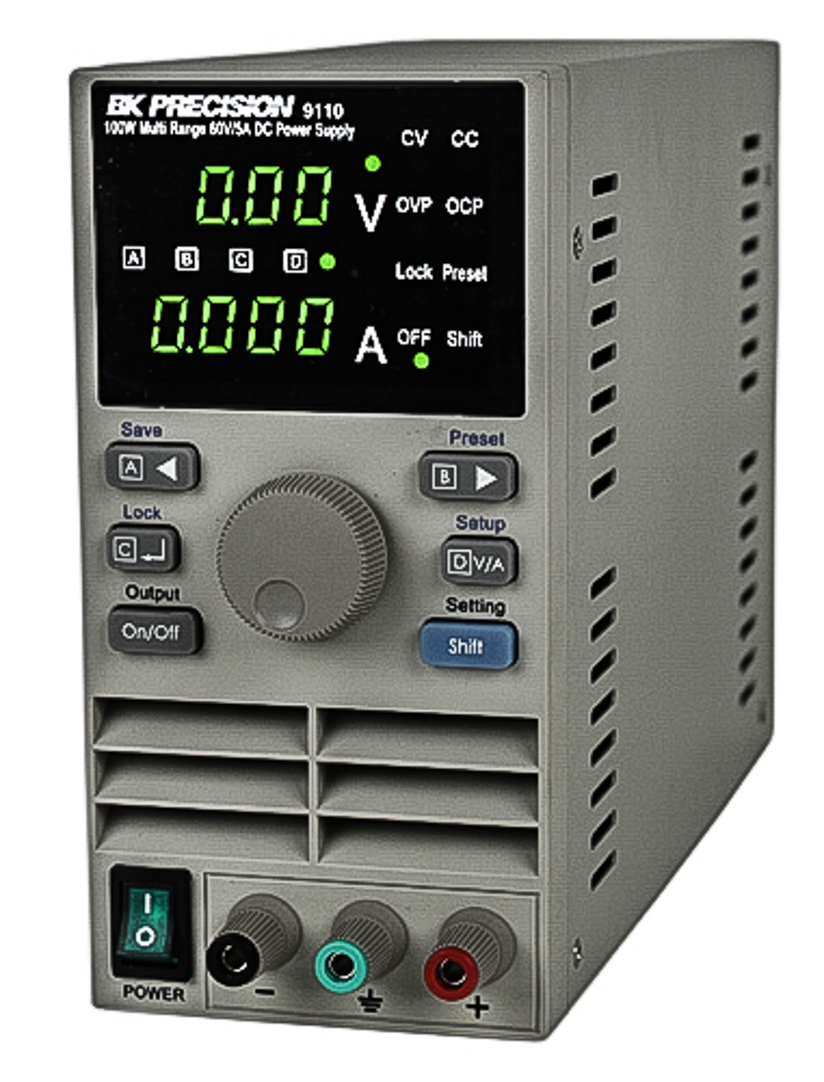 This is Digital Bench Power Supply 1 Output 0 → 60V 0 → 5A 100W manufactured by BK Precision. The manufacturer part number is BK9110. It is digital . Features a versatile binding post terminal output connector. It carries 5a output current. Additionally, the product is supplied with 1 outputs. The product has +40°c maximum temperature. The product 9110, is a highly preferred choice for users. Input connector of iec 320. Its bench power supply is of multi range dc power supply type . It has a model number bk9110. Features a 0 → 60v output voltage. Features 110 v ac, 220v ac supply voltage. While its minimum temperature is 0°c. It includes 2 display(s) . Feature 100w of power rating. It comes in digital configuration.