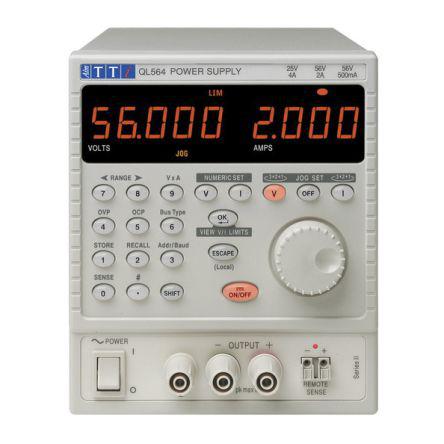 This is Bench Power Supply With RS Calibration 1 Output 0 → 25 V 0 → 56 V manufactured by Aim-TTi. The manufacturer part number is QL564. Additionally, the product is supplied with 1 outputs. The product has +40°c maximum temperature. It carries 2 a, 4 a output current. While its minimum temperature is +5°c. Input connector of iec 320. Features a versatile binding post terminal output connector. Features a 0 → 56v output voltage. Features 115 v ac, 230 v ac supply voltage. It includes 2 display(s) . Feature 112w of power rating. It comes in digital configuration.