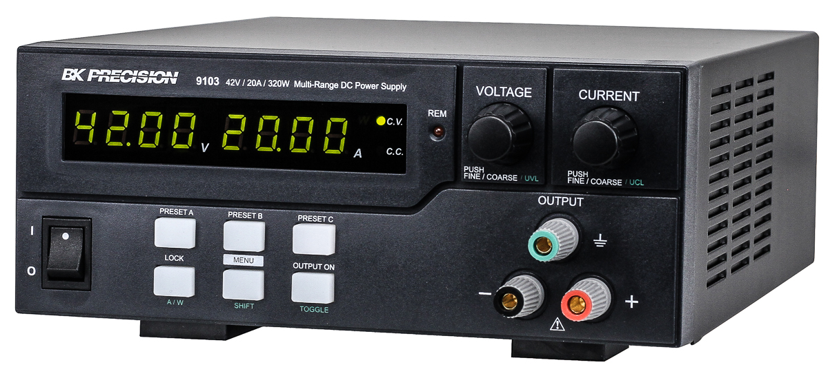 This is Digital Bench Power Supply 1 Output 0 → 42V dc 0 → 20A 320W manufactured by BK Precision. The manufacturer part number is BK9103. It is digital . Features a versatile binding post terminal output connector. It carries 20a output current. Additionally, the product is supplied with 1 outputs. The product has +40°c maximum temperature. The product 9103, is a highly preferred choice for users. Input connector of iec 320. Its bench power supply is of multi range dc power supply type . It has a model number bk9103. Features a 42v output voltage. Features 110 v ac, 220v ac supply voltage. While its minimum temperature is 0°c. It includes 2 display(s) . Feature 320w of power rating. It comes in digital configuration.