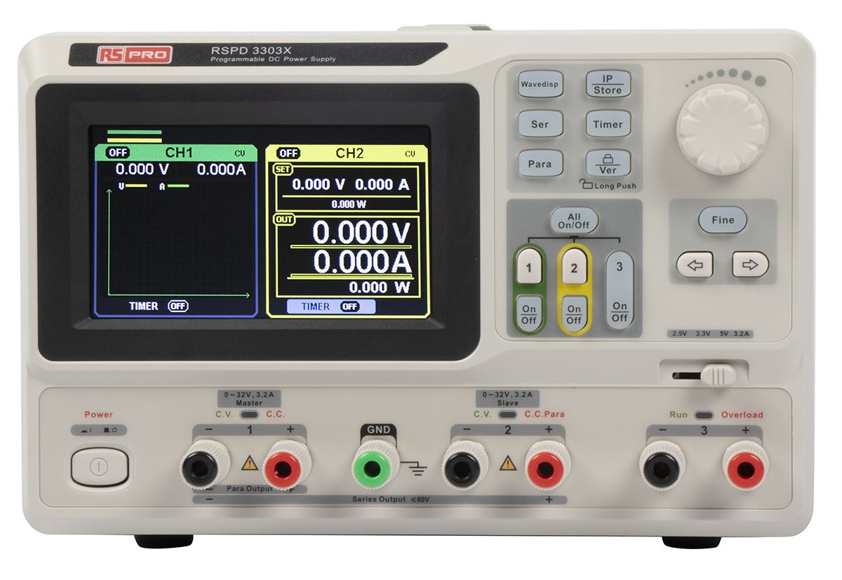 This is Bench Power Supply Programmable Linear 220W 3 Output 2 x 0 → 32 V 2.5 → 5 V 3.2A manufactured by RS PRO. The manufacturer part number is 123-6489. It is digital . The product has +40°c maximum temperature. It carries 3.2a output current. Additionally, the product is supplied with 3 outputs. While its minimum temperature is 0°c. Input connector of cee 7/7 german schuko / french. Its bench power supply is of programmable power supply type . Features a versatile lan, usb output connector. It is calibrated ukas . Features 230v ac supply voltage. Features a 2 x 0 → 32 v, 2.5 → 5v output voltage. It includes 2 display(s) . Feature 220w of power rating. It comes in digital configuration.