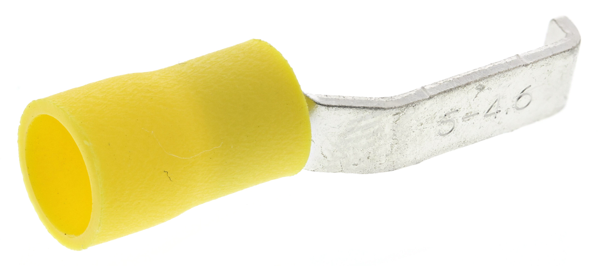 This is Hooked Insulated Crimp Blade Terminal 17.2mm Blade Length 4mm² to 6mm² 12AWG to 10AWG Yellow manufactured by RS Pro. The manufacturer part number is 624-1257. It is supplied as unshrouded. The wire has a maximum size of 6mm². Its blade is 4.6mm in width . While the minimum wire size AWG includes 12awg. It is offered with a standard blade thickness about 1mm . In addition, male is the available "Gender" of the product. It has a decent yellow colour. It has an overall length of 30.2mm. It is hooked yes . The blade has a length of 17.2mm. It has a robust vinyl insulation material. The high-quality tin is used as contact plating material. The inner diameter of the product is 6.4mm. Insulation Option: insulated. Its maximum wires size includes 10awg. On the other hand, the wire has 4mm² of minimum size. The product is made from sturdy copper materials.