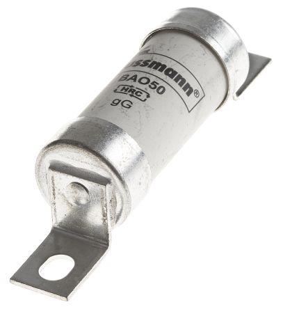 This is 50A A3 British Standard Fuse gG 550V ac manufactured by Cooper Bussmann. The manufacturer part number is BAO50. Concerning body diameter, it is 21mm. The product has a gg application category. The product has a current rating of 50 a. Moreover, the product has a nominal 550 v ac voltage rating. It has a typical 73.5mm fixing centres . A fuse with a a3 size. Its tag is 12.7mm wide . Moreover, it has a high rupture capacity yes . Its body height is 54.5mm. The fuse complies with bs 88, iec 269 standards. It has an overall length of 87mm.