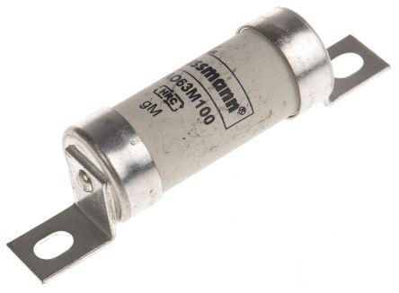 This is 63A A3 British Standard Fuse gG - gM 550V ac manufactured by Cooper Bussmann. The manufacturer part number is BAO63M100. Concerning body diameter, it is 21mm. The product has a gg - gm application category. The product has a current rating of 63 a. Moreover, the product has a nominal 550 v ac voltage rating. It has a typical 73.5mm fixing centres . A fuse with a a3 size. Its tag is 12.7mm wide . Moreover, it has a high rupture capacity yes . Its body height is 54.5mm. The fuse complies with bs 88, iec 269 standards. It has an overall length of 87mm.