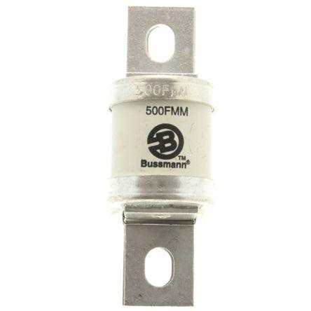 This is 500A 690V AC TYPE T FUSE manufactured by Cooper Bussmann. The manufacturer part number is 500FMM. Concerning body diameter, it is 38mm. The product has a current rating of 500 a. The fuse dimensions of the product is 38 dia. x 50mm . Moreover, the product has a nominal 500 v dc, 690 v ac voltage rating. It has a typical 85mm fixing centres . A fuse with a fmm size. Its tag is 25.4mm wide . Its body length is 50mm. The fuse has a robust t speed. The fuse complies with bs 88 standards. It has an overall length of 113mm.
