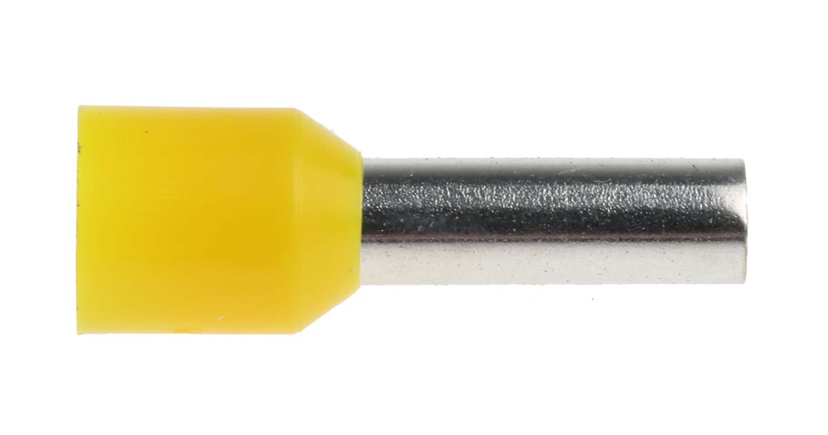 This is Insulated Crimp Bootlace Ferrule 12mm Pin Length 3.5mm Pin Diameter 6mm² Wire Size Yellow manufactured by RS Pro. The manufacturer part number is 513-2641. The pin is 12mm long. It has a decent yellow colour. While the minimum wire size AWG includes 10awg. It has 1 dedicated entries . It has a robust nylon insulation material. It has an overall length of 20.5mm. Insulation Option: insulated. The pin has 3.5 mm, 3.9mm caliber. On the other hand, the wire has 6mm² of minimum size. Its maximum wires size includes 10awg. The wire has a maximum size of 6mm².