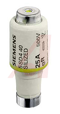 This is 25A Bottle Fuse E27 Thread Size gR 500V ac/dc manufactured by Siemens. The manufacturer part number is 5SD440. Its bottle fuse is of dii size . In addition, it has primary keyword like bottle fuse . Moreover, the product has a nominal 500v ac/dc voltage rating. The product has a gr application category. It has a typical thread size of e27. Whereas, the minimum operating temperature of the product is -5°c. The product has a current rating of 25a. It has a maximum operating temperature of +40°c.