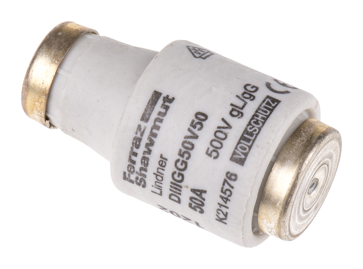 D-Fuse (DIAZED) Type gL/gG - Ferraz Shawmut Breaking Capacity 50kA at 500Vac Voltage rating 500Vac Low power loss Dimensions, all fuses 50mm in length DI Conductor DII Conductor DII Conductor 2A 13.2 and 6mm 2A 21.5 and 6mm 35A 27 and 16mm 4A 13.2 and 6mm 4A 21.5 and 6mm 50A 27 and 18mm 6A 13.2 and 6mm 6A 21.5 and 6mm 63A 27 and 20mm 10A 13.2 and 8mm 10A 21.5 and 8mm 16A 13.2 and 10mm 16A 21.5 and 10mm 20A 13.2 and 12mm 20A 21.5 and 12 mm 25A 13.2 and 14mm 25A 21.5 and 14 mm Standards IEC269; VDE0636; DIN49522 Approvals VDE 0636; DIN 49522