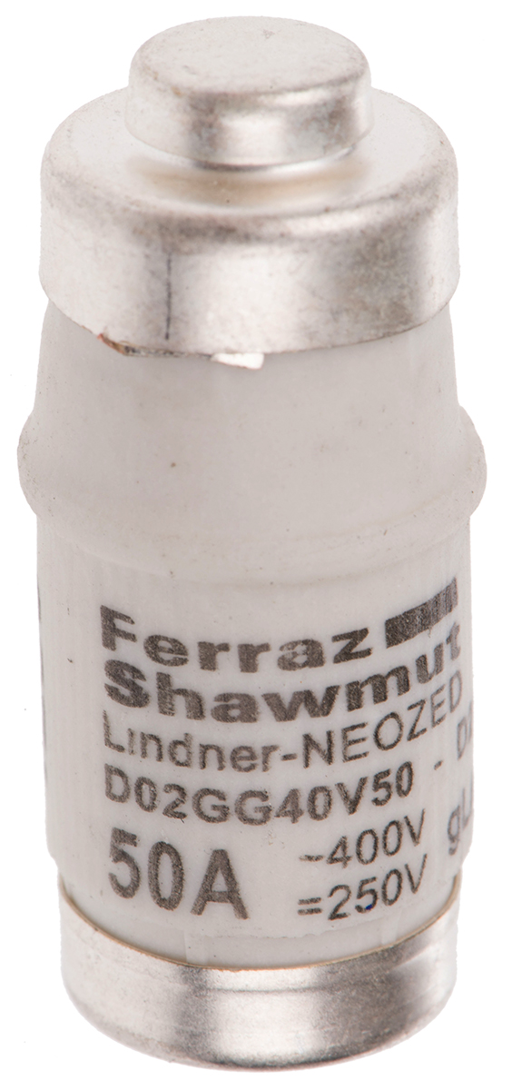 This is 50A D02 Neozed Fuse gG 400V ac manufactured by Mersen. The manufacturer part number is D215191. It has a white colour gauge/cap . Its bottle fuse is of d02 size . In addition, it has primary keyword like neozed fuse . Moreover, the product has a nominal 400v ac voltage rating. The product has a gg application category. The product's body is nicely designed from ceramic materials. Whereas, the minimum operating temperature of the product is -40°c. The product has a current rating of 50a. The product has 50 ka @ 500 v ac breaking capacity at maximum voltage rating.