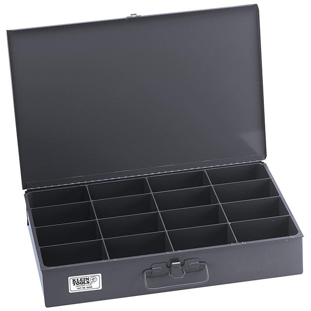This is manufactured by Klein Tools, Inc.. The manufacturer part number is 54445. The product is made from highly stable and reliable metal, steel. It is assigned with possible HTSUS value of 7310.29.0065. The product is not applicable. Features a typical area dimensions of 216in² (1394cm²). A type of component storage container. The product's diameters include 17.992" l x 12.008" w (457.00mm x 305.00mm). Its typical moisture sensitivity level is not applicable. The splendid features of the product include compartments/drawers - 16. It has a classic gray colour. In addition, the height is 2.992" (76.00mm). In addition, bulk is the available packaging type of the product. Design Information: hinged door, lid. The product is designated with the ear99 code number.