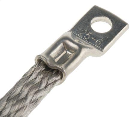 This is Braided Earth Lead M6 Stud Size 150mm manufactured by RS Pro. The manufacturer part number is 164-2173. Moreover, this cable has a earth lead shape. The conductor is made from copper material. It has a standard m6 size stud . Its accurate length is 150mm. The product has 15 mm² cross section area.
