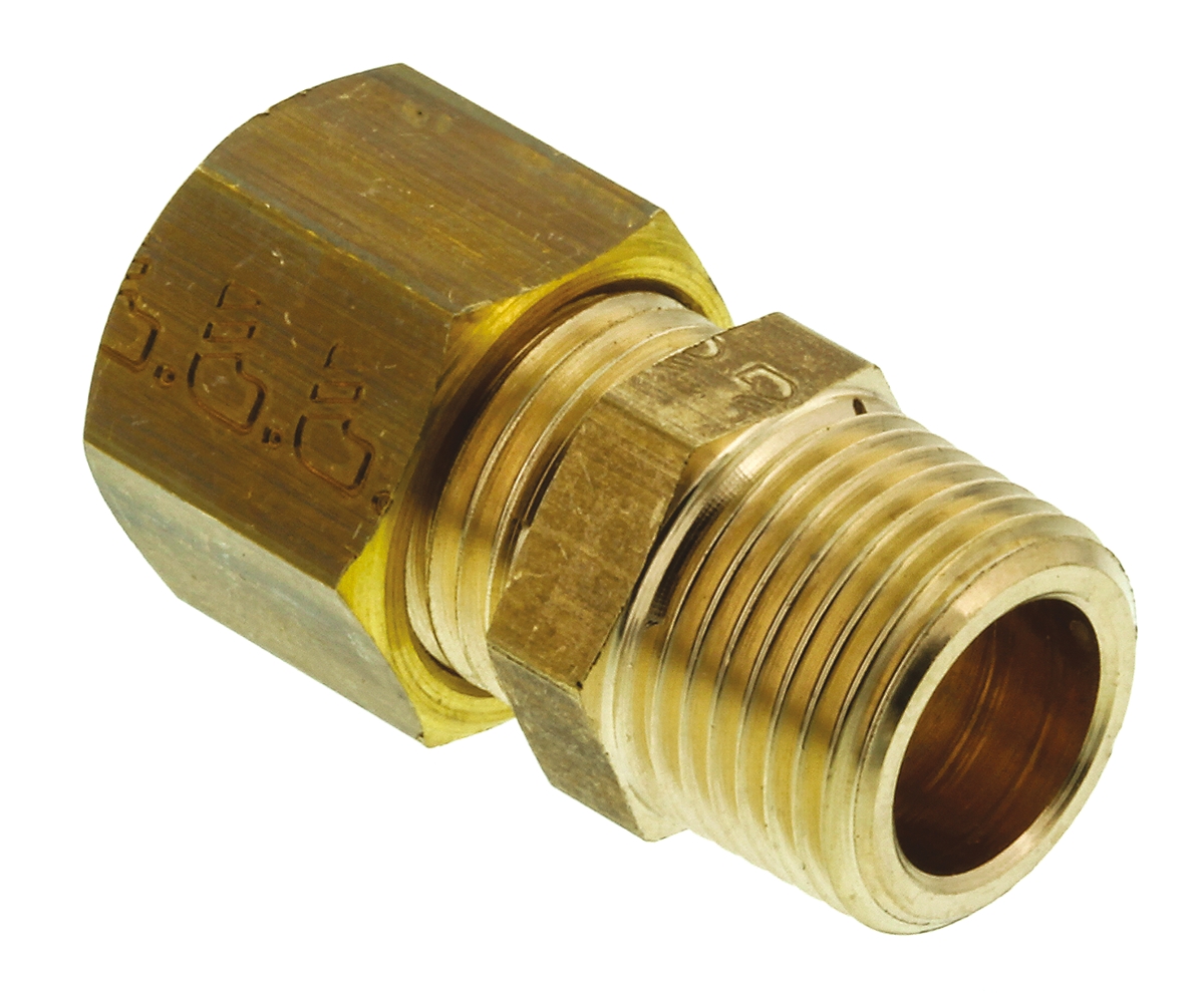 This is 10mm x 3/8 in BSPT Male Straight Coupler Brass Compression Fitting manufactured by Legris. The manufacturer part number is 0105 10 17.