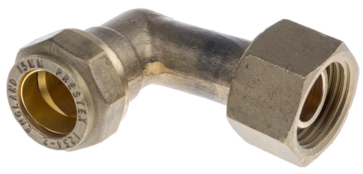 This is 15mm 90° Tap Adapter Brass Compression Fitting manufactured by RS Pro. The manufacturer part number is 432-0443. This tap adapter tool is easy to use with versatile applications in various settings. The product is made from highly stable and reliable brass. The fitting direction is 90° .