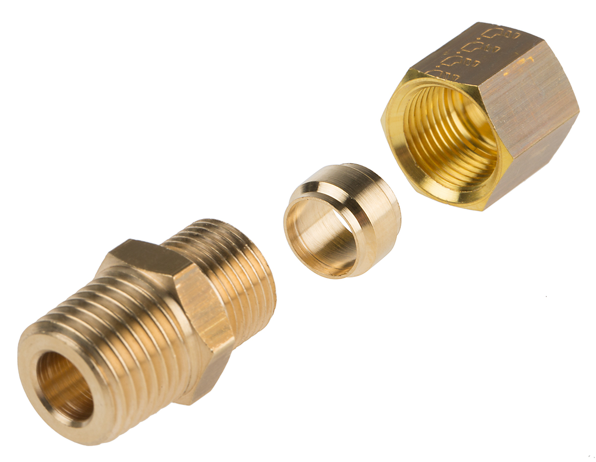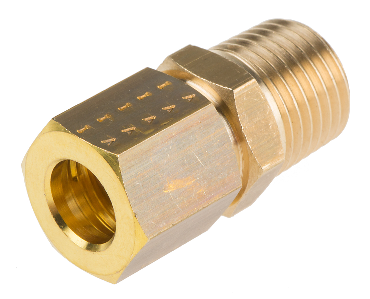 This is 8mm x 1/4 in BSPT Male Straight Coupler Brass Compression Fitting manufactured by Legris. The manufacturer part number is 0105 08 13.