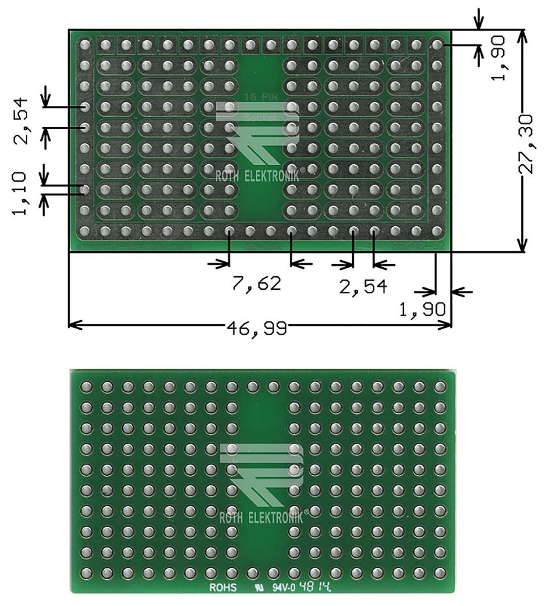 This is Breadboard Solderable Breadboard With Adaption Circuit Board 46.99 x 27.3 x 1.5mm manufactured by Roth Elektronik. The manufacturer part number is RE943-S2. Furthermore, the product is 27.3mm wide. Its accurate length is 46.99mm. It comes in solderable breadboard with adaption circuit board configuration. The given dimensions of the product include 46.99 x 27.3 x 1.5mm. In addition, the height is 1.5mm.