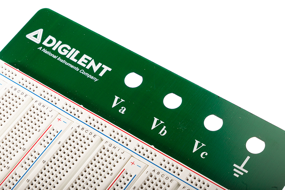 The Digilent 340-002-1 Solderless Breadboard Kit is a large-format prototyping platform engineered for students, labs, and engineers demanding extensive tie-point capacity and flexible circuit construction. Measuring approximately 230 mm × 175 mm × 31 mm, it features three 630-tie-point terminal strips, five 100-tie-point distribution strips (for a total of 2,390 tie points), and comes mounted on a rugged steel backing plate with four screw terminals for power connections and adhesive rubber feet for secure placement.