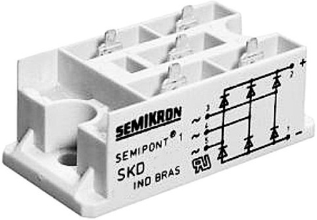 This is 3-phase Bridge Rectifier Module 800V 7-Pin A 46 manufactured by Semikron. The manufacturer part number is SKD 31/08. The given dimensions of the product include 93 x 20 x 30mm. It contains a/an three phase type bridge . Moreover, a bespoke product has 1.5ka peak non-repetitive forward surge current. In addition, the height is 30mm. It has a typical 15ma peak reverse current . Furthermore, the product is 20mm wide. Its accurate length is 93mm. The package is a sort of a 46. While having the peak reverse repetitive 800v. Whereas, the minimum operating temperature of the product is -40 °c. The product is available in panel mount configuration. The product is available in single configuration. It has a maximum operating temperature of +125 °c. It contains 7 pins.