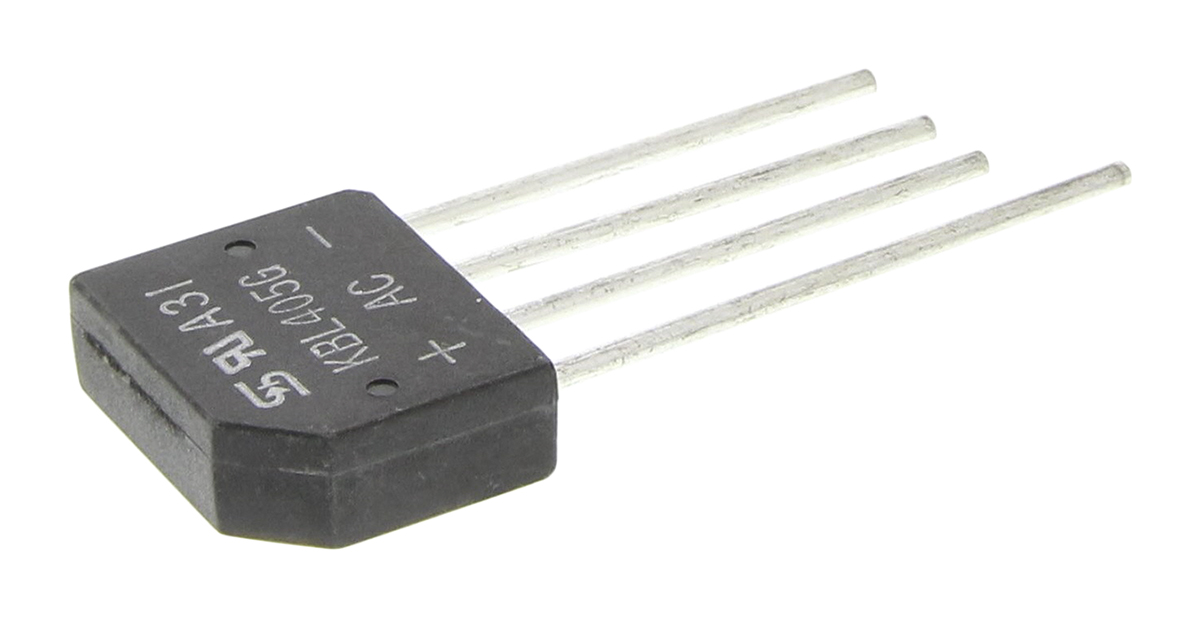 This is Bridge Rectifier 4A 600V 4-Pin KBL manufactured by Taiwan Semiconductor. The manufacturer part number is KBL405G T0. It has a typical 10µa peak reverse current . The given dimensions of the product include 19.6 x 6.48 x 16.38mm. It contains a/an single phase type bridge . The product utilizes silicon junction diode technology. Additionally, it has about 4a of peak average forward current . Moreover, a bespoke product has 150a peak non-repetitive forward surge current. In addition, the height is 16.38mm. Whereas, the peak forward voltage is about 1.1v . Furthermore, the product is 6.48mm wide. Its accurate length is 19.6mm. The package is a sort of kbl. While having the peak reverse repetitive 600v. Whereas, the minimum operating temperature of the product is -55 °c. The product is available in through hole configuration. The product is available in single configuration. It has a maximum operating temperature of +150 °c. It contains 4 pins.