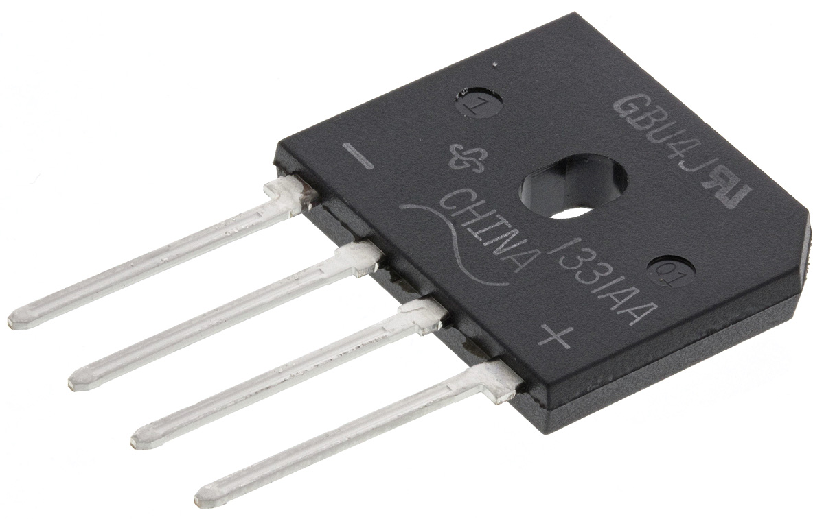 This is Bridge Rectifier 4A 600V 4-Pin GBU manufactured by Vishay. The manufacturer part number is GBU4J-E3/45. It has a typical 5µa peak reverse current . The given dimensions of the product include 22.3 x 3.56 x 18.8mm. It contains a/an single phase type bridge . The product utilizes silicon junction diode technology. Additionally, it has about 4a of peak average forward current . Moreover, a bespoke product has 150a peak non-repetitive forward surge current. In addition, the height is 18.8mm. Whereas, the peak forward voltage is about 1v . Furthermore, the product is 3.56mm wide. Its accurate length is 22.3mm. The package is a sort of gbu. While having the peak reverse repetitive 600v. Whereas, the minimum operating temperature of the product is -55 °c. The product is available in through hole configuration. The product is available in single configuration. It has a maximum operating temperature of +150 °c. It contains 4 pins.