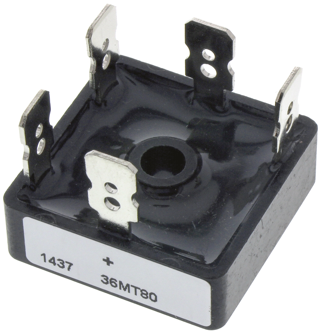 This is 3-phase Bridge Rectifier 35A 800V 5-Pin D 63 manufactured by Vishay. The manufacturer part number is VS-36MT80. It has a typical 200µa peak reverse current . The given dimensions of the product include 28.5 x 28.5 x 10mm. It contains a/an three phase type bridge . Moreover, a bespoke product has 500a peak non-repetitive forward surge current. Additionally, it has about 35a of peak average forward current . In addition, the height is 10mm. Whereas, the peak forward voltage is about 1.19v . Furthermore, the product is 28.5mm wide. Its accurate length is 28.5mm. The package is a sort of d 63. While having the peak reverse repetitive 800v. Whereas, the minimum operating temperature of the product is -55 °c. The product is available in through hole configuration. The product is available in single configuration. It has a maximum operating temperature of +150 °c. It contains 5 pins.