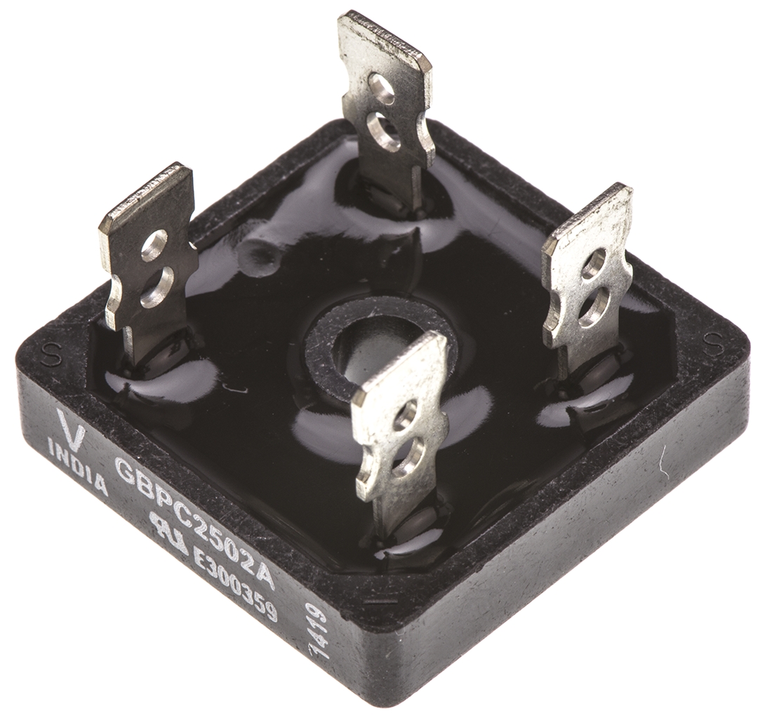 This is Bridge Rectifier 25A 200V 4-Pin GBPC-A manufactured by Vishay. The manufacturer part number is VS-GBPC2502A. The product complies with automotive standard - no. The product is available in single configuration. The product vs-gbpc, is a highly preferred choice for users. In addition, the height is 7.7mm. Furthermore, the product is 28.6 mm wide. Its accurate length is 28.6mm. The package is a sort of gbpc. Whereas, the minimum operating temperature of the product is -55°c. Whereas it is comprised of 1 phases. bridge rectifier is a versatile product designed to provide user-defined applications. It has a maximum operating temperature of 150°c. It contains 4 pins. It has a screw type mount .