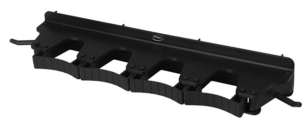 This is Tool Flex Wall bracket 4-6 Products Bl manufactured by Vikan. The manufacturer part number is 10189. The product is available in wall configuration. It has a decent black colour. The product is made from highly stable and reliable polypropylene. Furthermore, the product is 80mm wide. The product is for food industry usage . It is FDA compliant yes . Additionally, it has 4 tools held . Additionally, it has a clip type attachment .